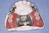 コーヌスクローネの義歯。金属の外冠が、前出の内冠にはまりこむ。 |