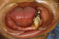上の奥歯に、アタッチメント入れ歯がはいっている状態。外側に、金属は見えていない。 下の奥歯の部分は、インプラント治療がなされている。 |